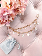Premium Design: Featuring a mix of seven charms set on a gold link chain and topped with a luxurious gold chain for added elegance. The piece is completed with two gold snap hooks, making it easy to attach to your favorite bags.